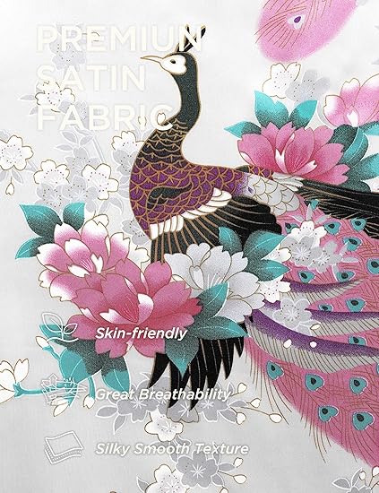 BABEYOND Women’s Long Satin Kimono Robe – Elegant Nightgown with Peacock & Blossom Print | Silky Loungewear