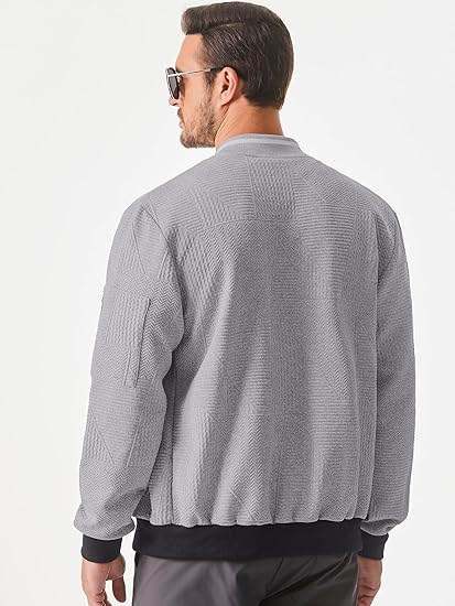 • Stylish Design: This men's bomber jacket features a modern, sleek design with a subtle geometric pattern, making it perfect for both casual and semi-formal occasions. The contrasting black cuffs and hem add a touch of sophistication to the overall look.
